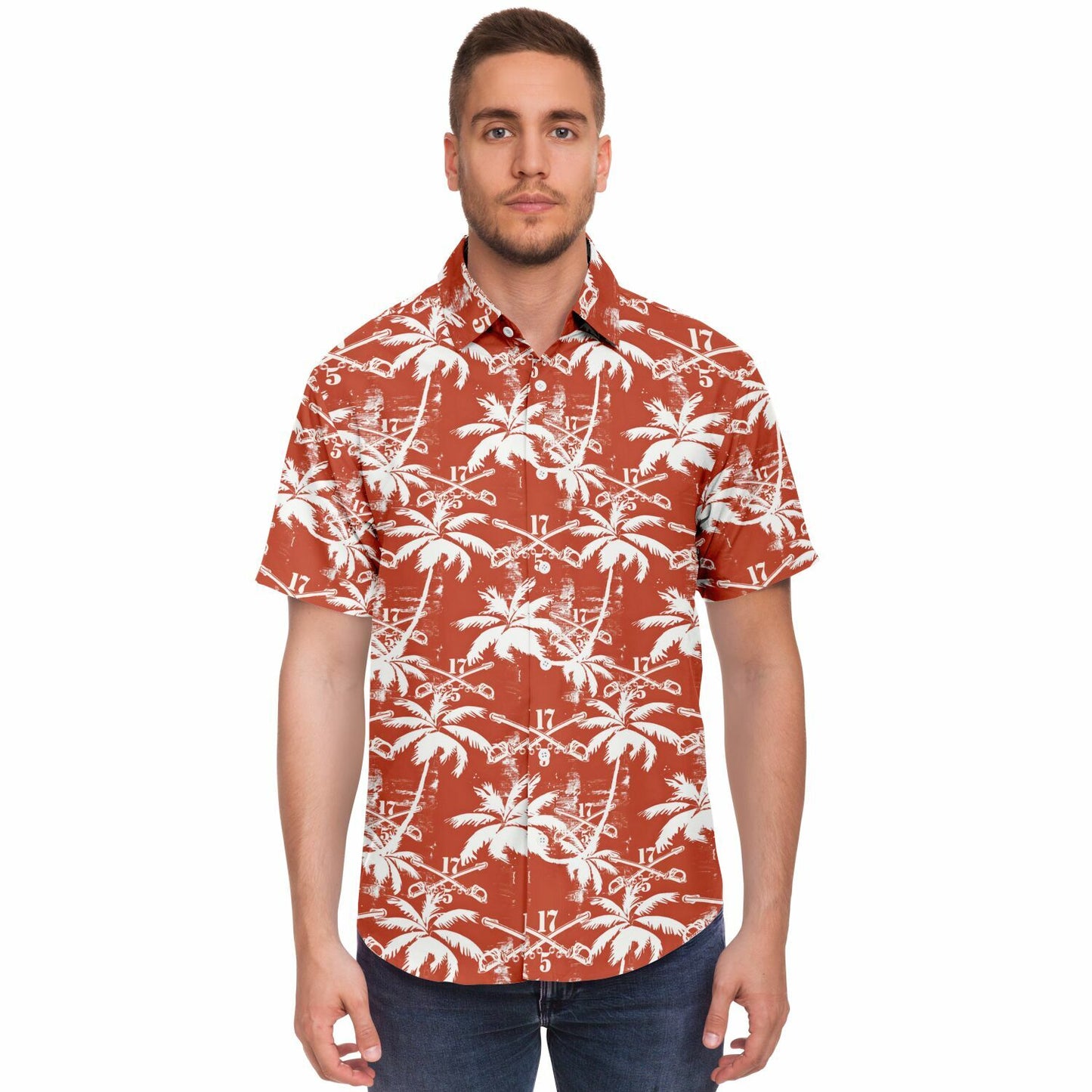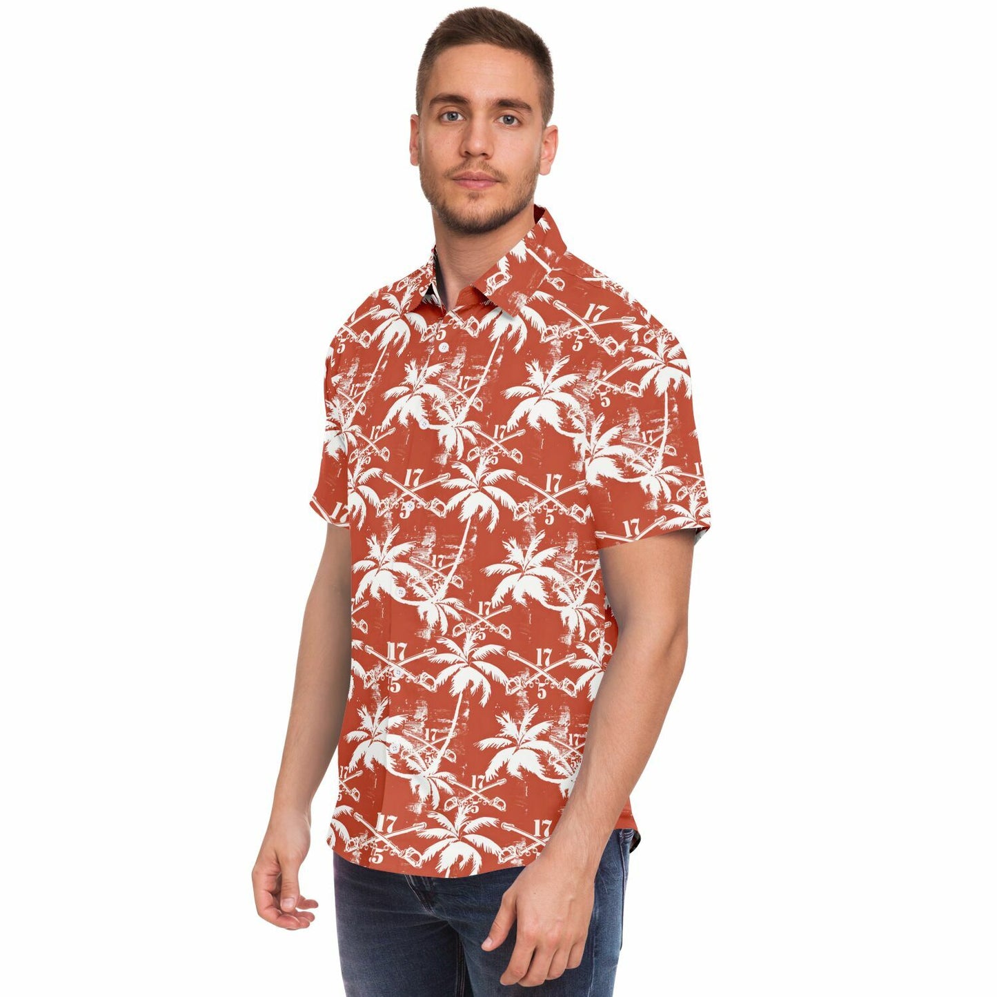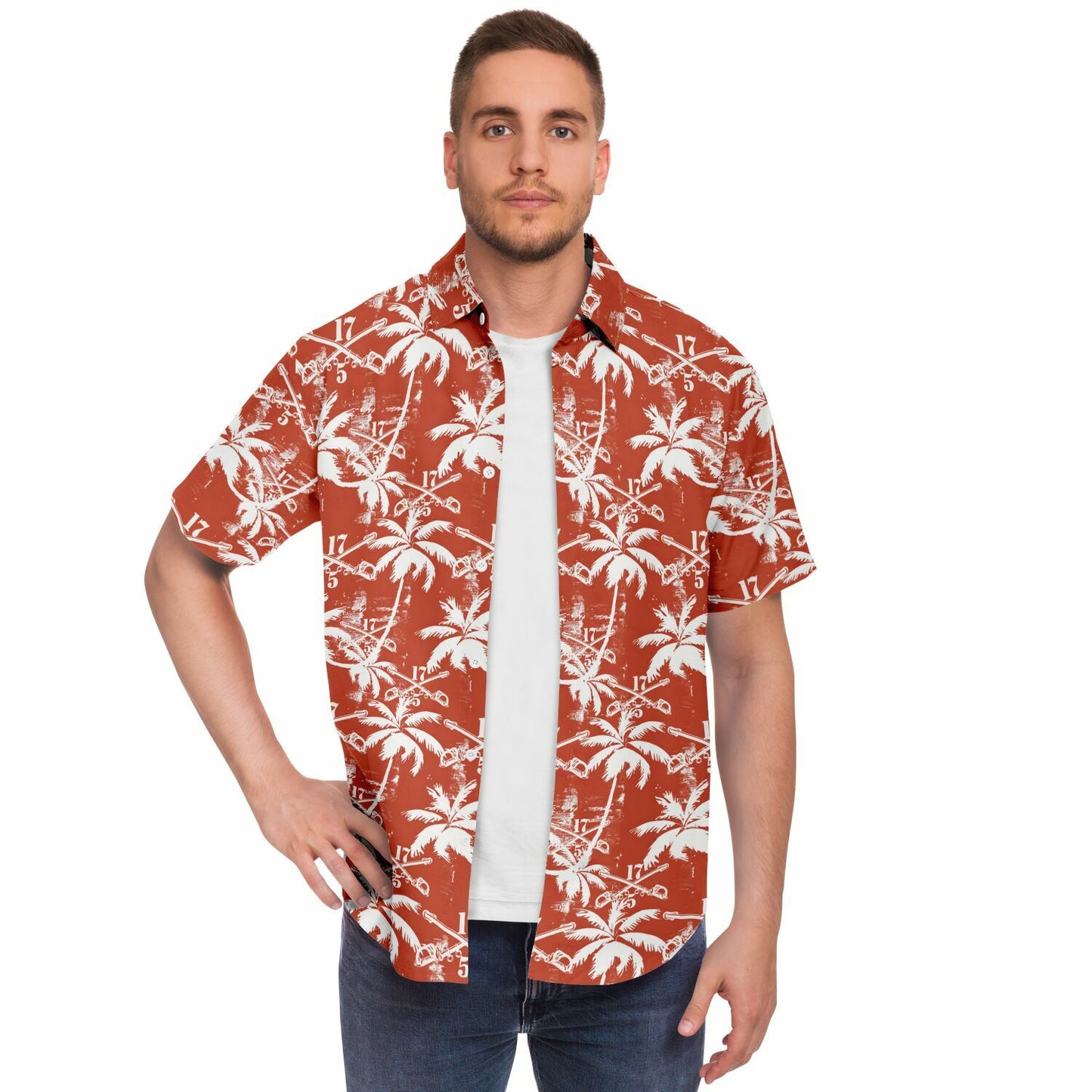 This shirt isn’t just an outfit; it’s a statement. Perfect for blending in with the flora while standing out among the ranks, the "Sabers & Palms" Hawaiian Shirt is your go-to gear for off-duty adventures. Show the world that the 5-17 Air Cavalry Squadron knows how to relax with the best of them—armed with aloha and ready for anything!
