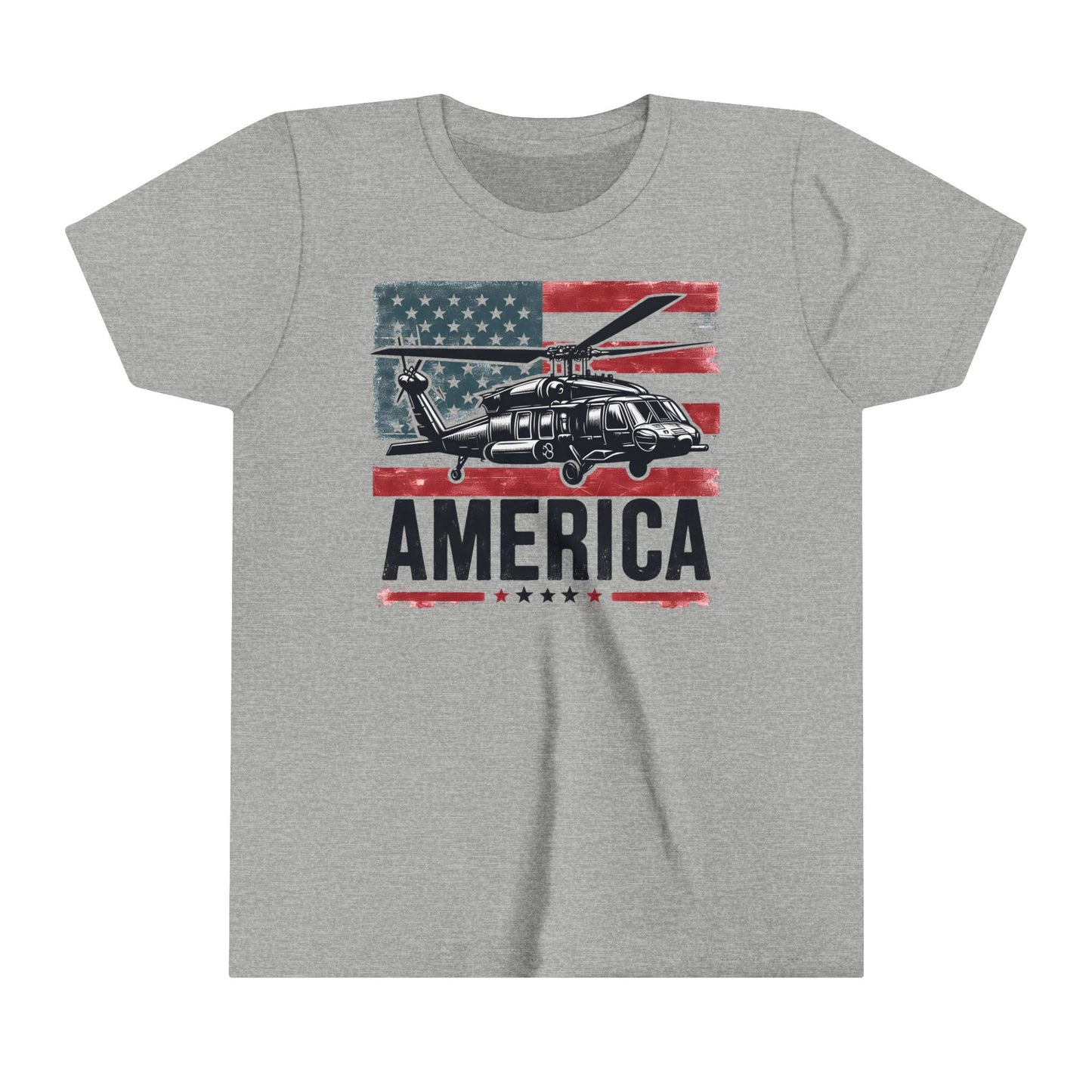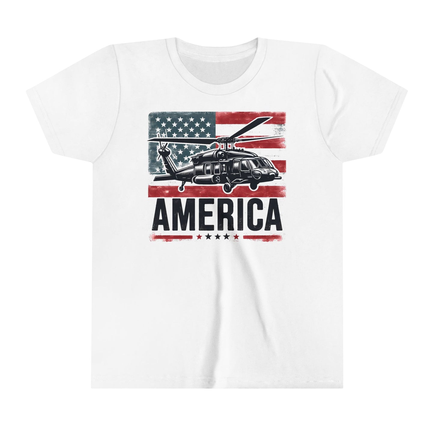 Celebrate the 4th of July in style with our patriotic T-shirt! Made from 100% soft, breathable cotton, this tee features a bold American flag design, accented by a Blackhawk helicopter and the word "America." Perfect for showing your love for the land of the free, whether you're at a BBQ, watching fireworks, or just enjoying the summer sun. Embrace your patriotism with this standout shirt, designed for true American pride.