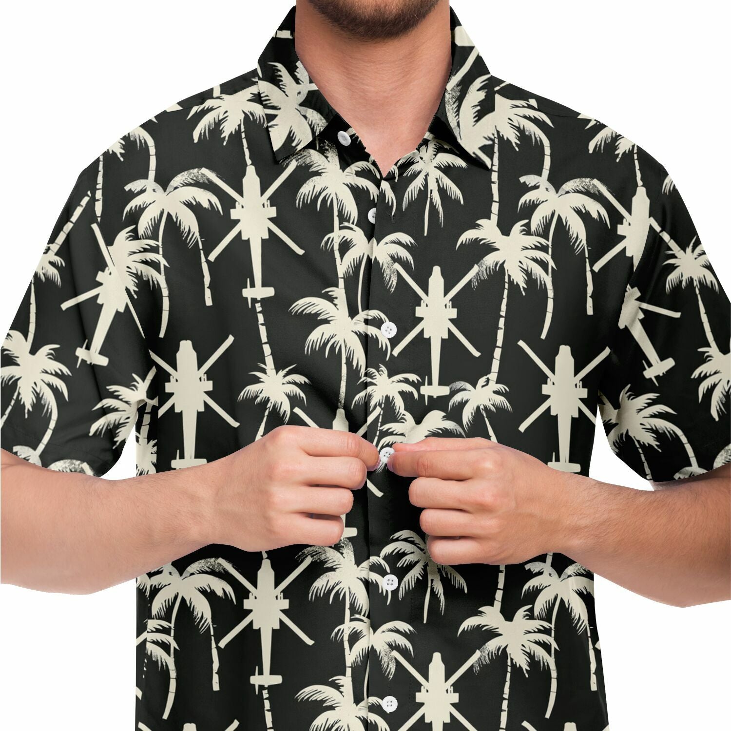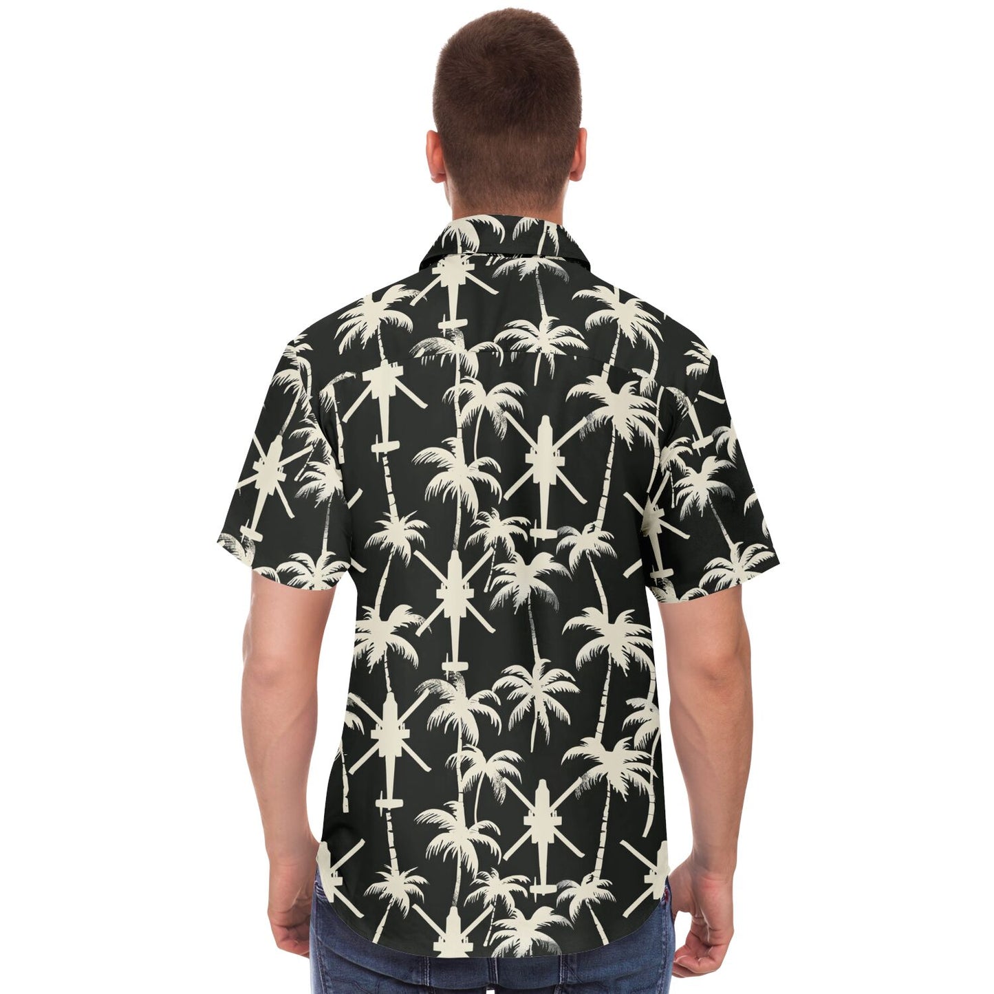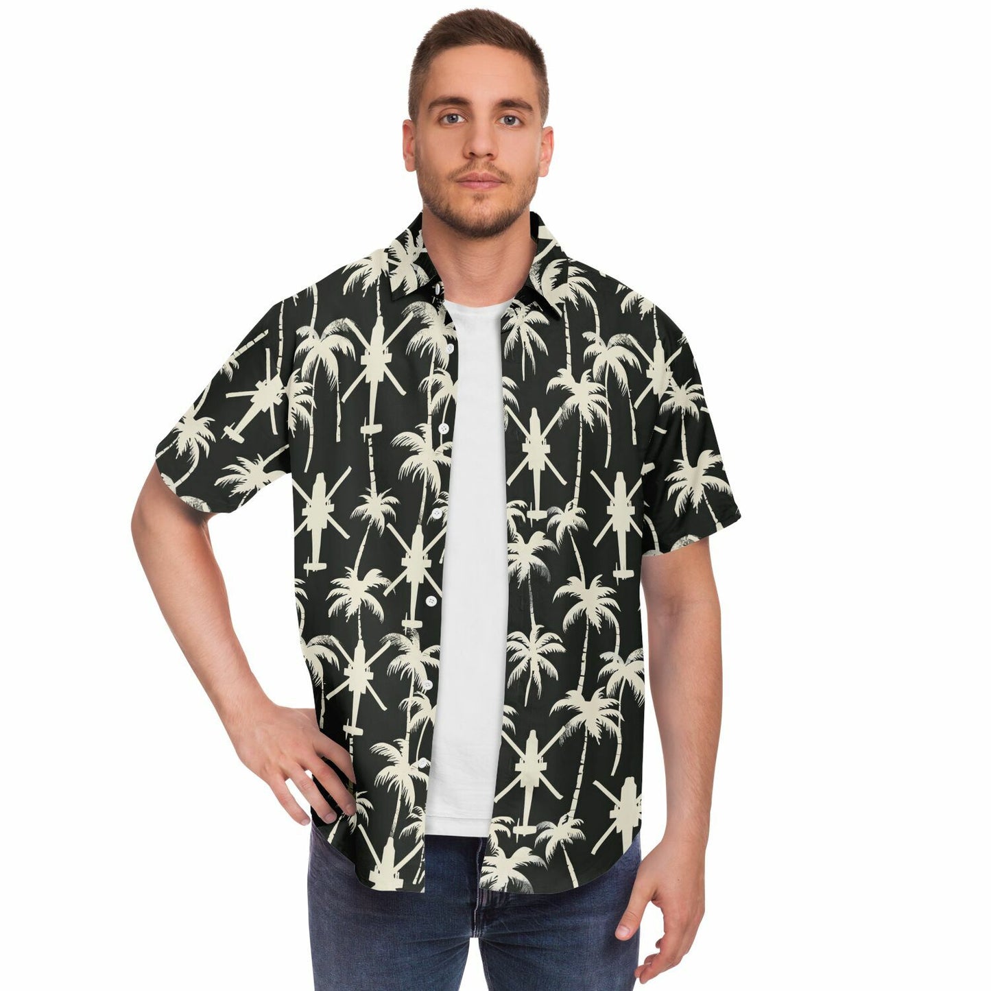 "Apache Palms" 셔츠를 소개합니다. 열대 지방의 휴양과 전술적 임무를 동시에 수행할 수 없다고 누가 말했습니까? 흔들리는 야자수의 고요한 배경, 섬 휴식의 전형, 그런데 잠깐만요, 머리 위에서 윙윙거리는 저 소리는 무엇일까요? 아, 아파치 헬리콥터 편대가 여러분의 여유로운 루아우에 공중 모험을 더해줄 뿐입니다! 이 셔츠는 단지 패션을 표현하는 것이 아닙니다. 천국과 파워를 유쾌하게 결합하여 어디를 가든 시선을 사로잡고 대화를 촉발할 것입니다. 따라서 코코넛 칵테일을 마실 때나 다음 공중 기동을 계획할 때 이 셔츠는 코미디적인 매력이 가미된 스타일을 보장합니다!