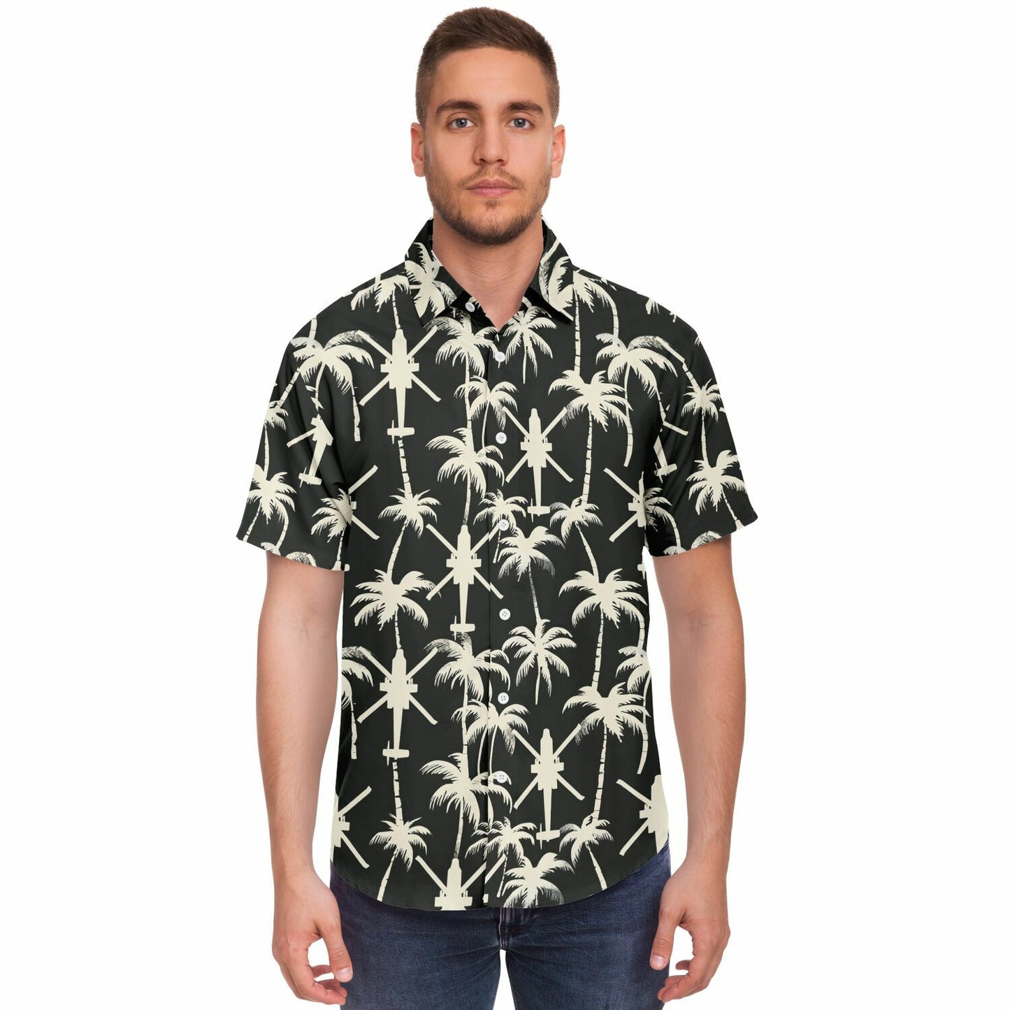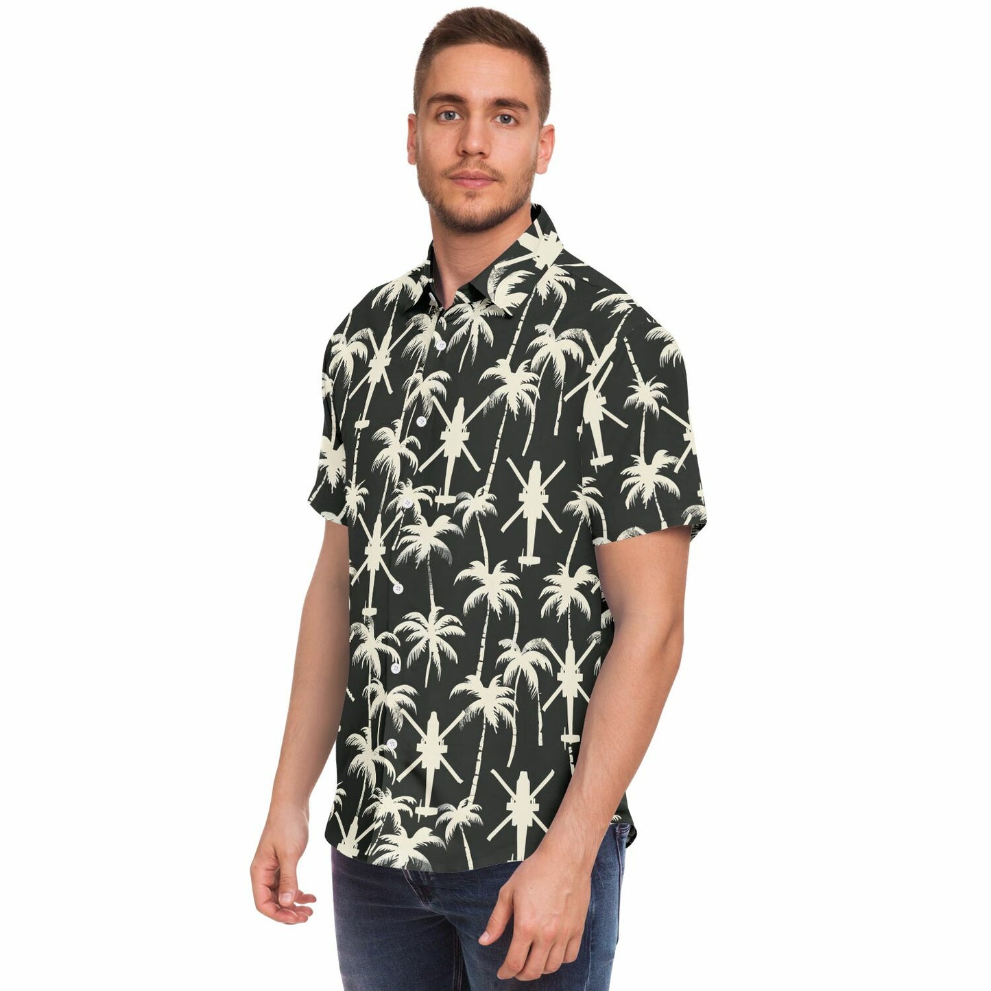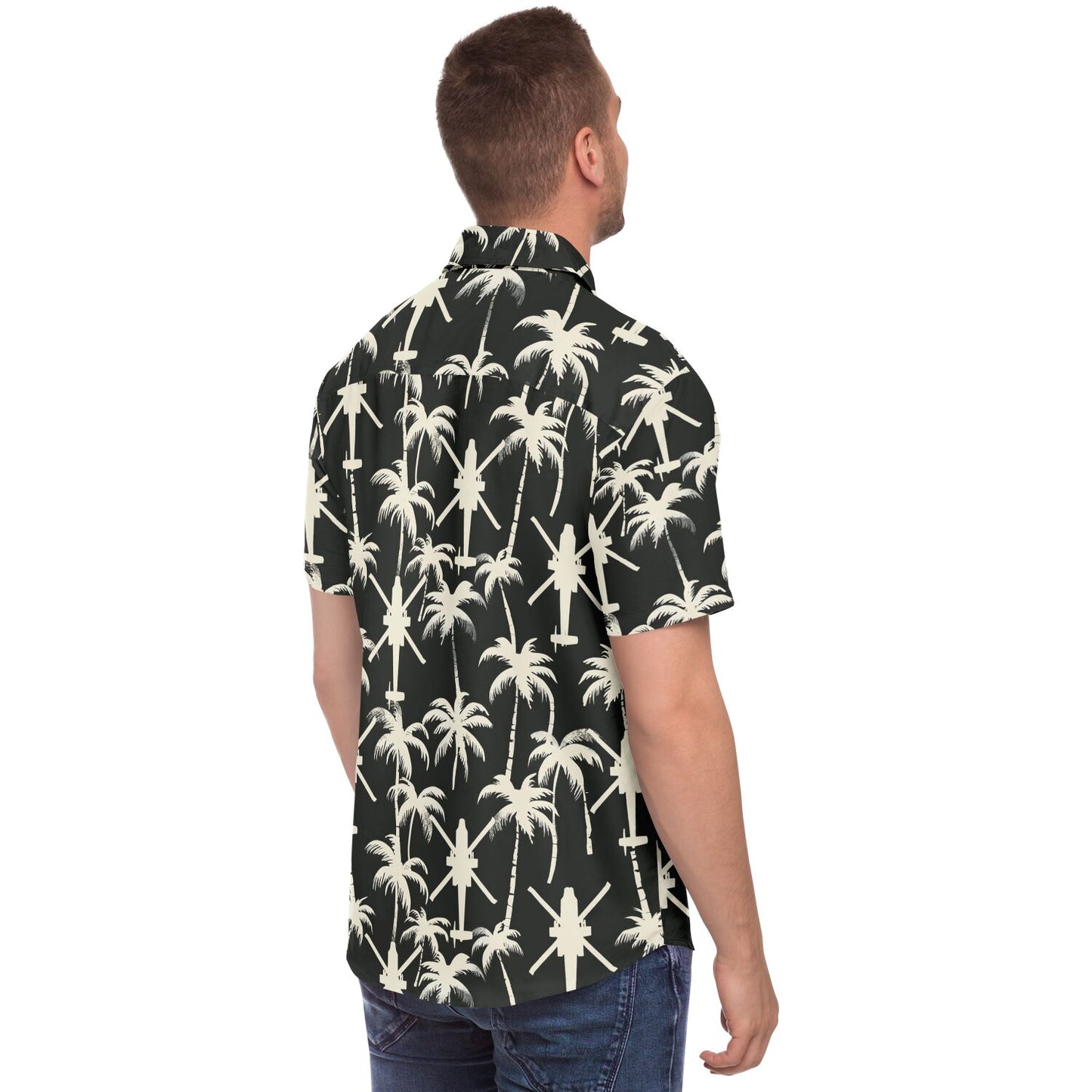 "Apache Palms" 셔츠를 소개합니다. 열대 지방의 휴양과 전술적 임무를 동시에 수행할 수 없다고 누가 말했습니까? 흔들리는 야자수의 고요한 배경, 섬 휴식의 전형, 그런데 잠깐만요, 머리 위에서 윙윙거리는 저 소리는 무엇일까요? 아, 아파치 헬리콥터 편대가 여러분의 여유로운 루아우에 공중 모험을 더해줄 뿐입니다! 이 셔츠는 단지 패션을 표현하는 것이 아닙니다. 천국과 파워를 유쾌하게 결합하여 어디를 가든 시선을 사로잡고 대화를 촉발할 것입니다. 따라서 코코넛 칵테일을 마실 때나 다음 공중 기동을 계획할 때 이 셔츠는 코미디적인 매력이 가미된 스타일을 보장합니다!