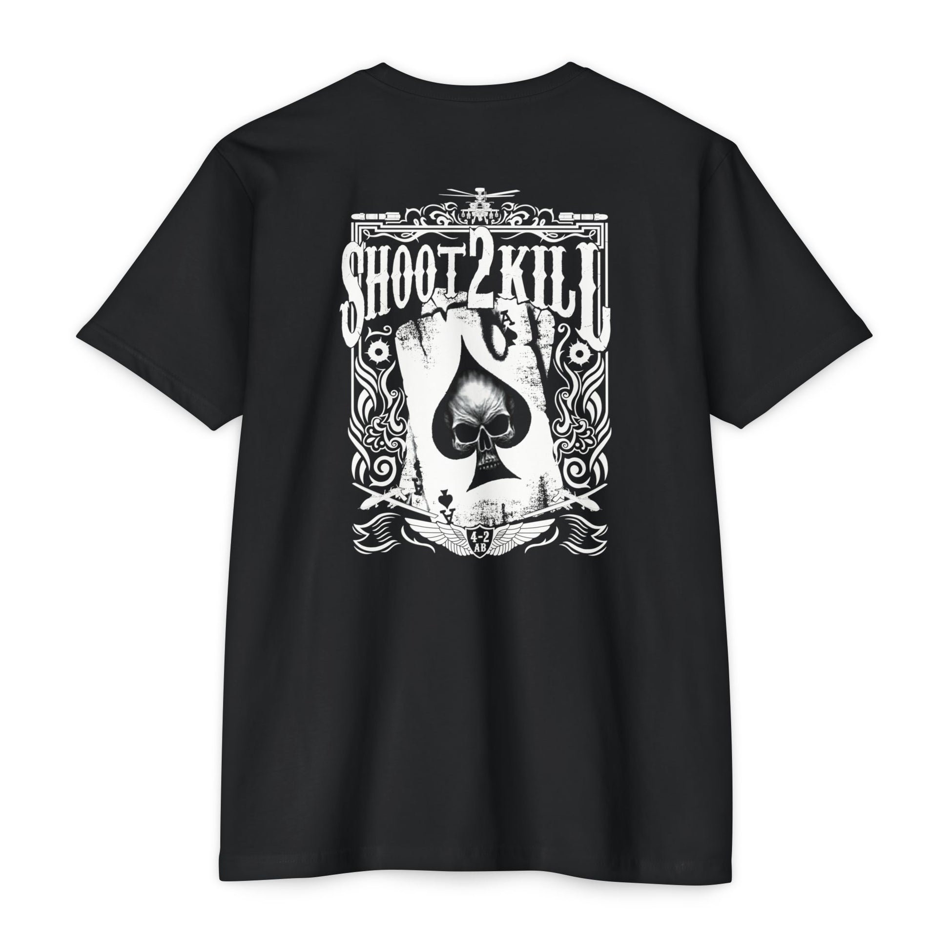 This 60% cotton 40% polyester T-shirt showcases a design tailored for a US Army attack battalion. The bold imagery prominently features the words "Shoot to Kill," embodying the unit's resolute and mission-oriented mindset. The graphic is intricately crafted, conveying a sense of determination and strength associated with the battalion's purpose.
