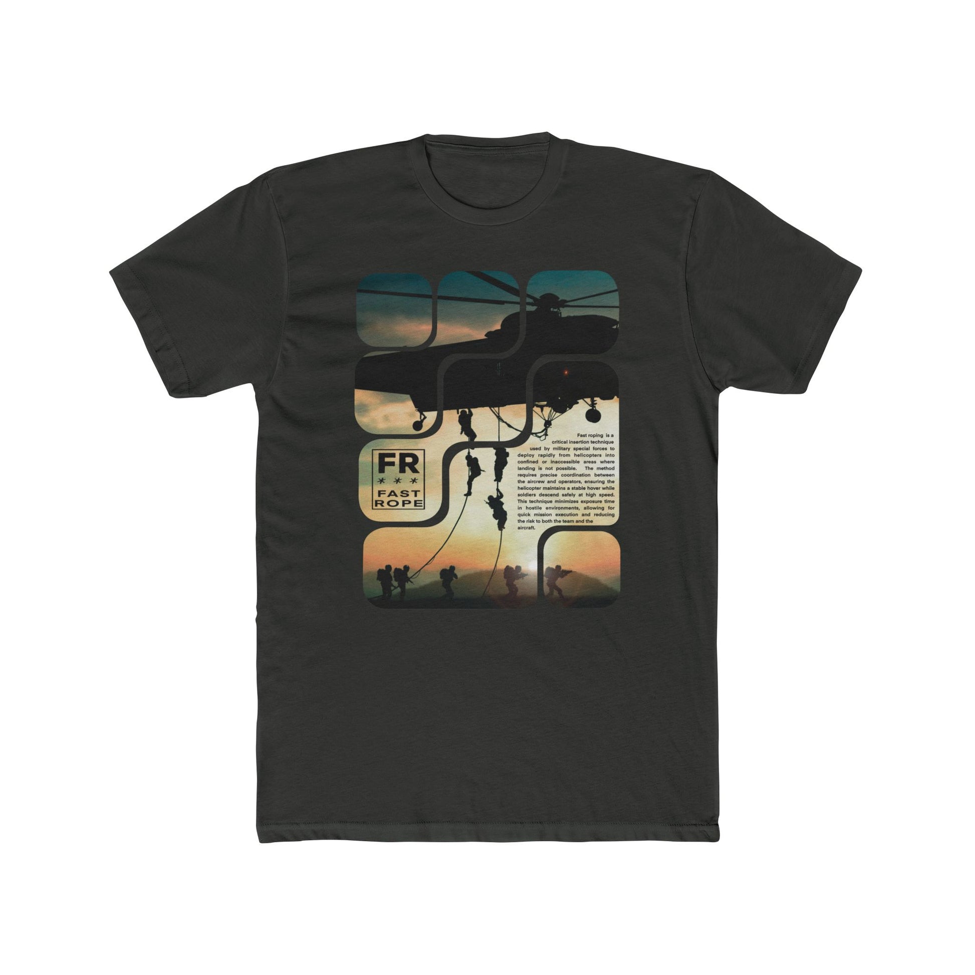 Celebrate the skill and precision of military special forces with our Fast Rope Precision T-Shirt. Made from 100% premium cotton, this comfortable and durable shirt features a bold graphic of soldiers fast roping from a helicopter, symbolizing the speed and coordination required for this essential insertion technique. The design is paired with informative text detailing the role of fast roping in rapid deployments where landing isn’t possible, highlighting its importance in high-stakes operations. Perfect for aviation enthusiasts, military supporters, or anyone inspired by tactical excellence, this shirt is your go-to for both style and substance.